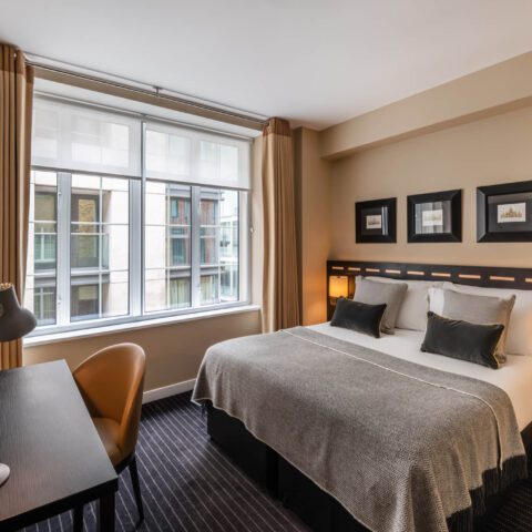 Our Standard Double rooms, approximately 16m2, are designed with style and comfort in mind. The rooms include a pocket-sprung king-sized bed wth spacious bathrooms with a powerful shower (walk-in or over bath). You will also find one of our signature mini-kitchens with a fridge, microwave, kettle, BRITA filter tap, Nespresso coffee machine and complimentary teas and coffee. Enjoy interactive HD TVs, versatile dining / work tables with handy USB and power points making our rooms your home away from home.